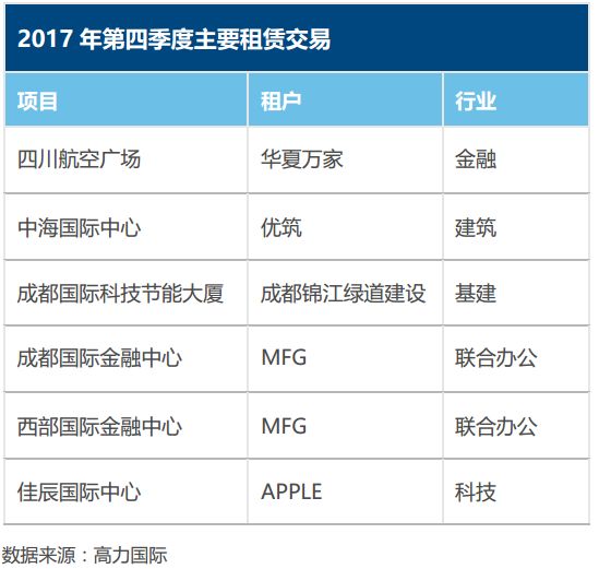 2017年灵活办公物业在成都甲级写字楼市场上发展态势良好,业主对与联合办公物业合作态度积极,众多联合办公品牌在成都继续拓展的意愿也较强烈。成都“双创”效应持续发酵,聚集了大量双创人口和创业公司,这将为未来成都联合办公产业的发展提供坚实的需求支撑。高力预计,2018年成都联合办公物业将保持约20%的扩张速度。