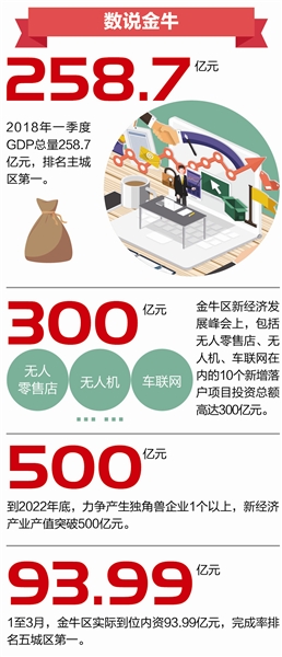新经济浪潮下,金牛雄心勃勃:在逐步构建优势突出、特色明显、竞争力强的新经济产业体系,优化形成“城、带、园、点”各有侧重、互促发展的生态格局,到 2022年初步建成科技成果转化率高、各类新经济主体活跃、高新技术产业产值领先的新经济发展先进城区。